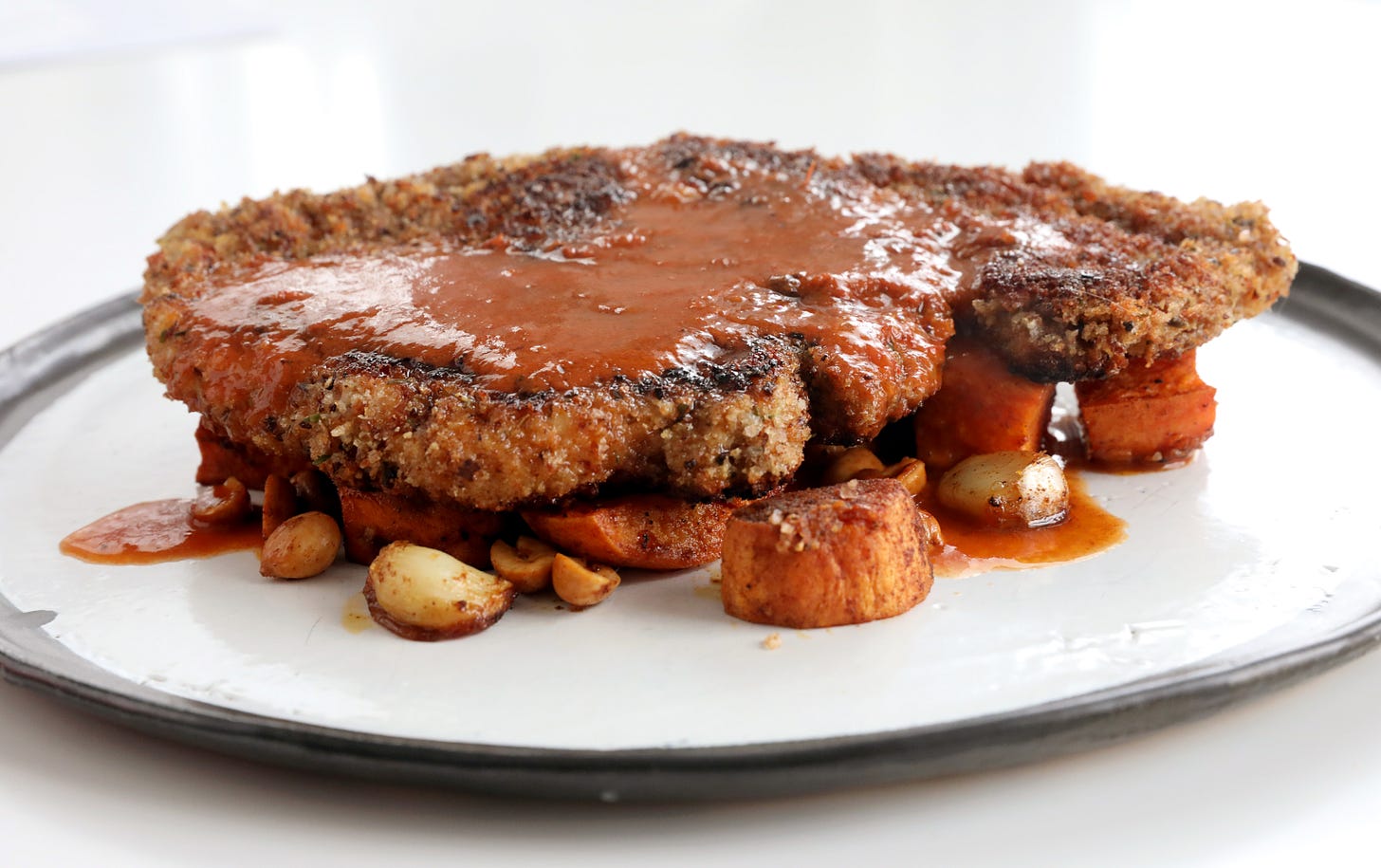 Those components are a breaded cutlet, a three-ingredient sheet pan roast, and a sexy sauce. They’re all easy and familiar, and thus bound to please a range of eaters, but each one has an element that sets it apart from the everyday—even though this is absolutely an everyday dinner in terms of the effort required. And of course you can make these parts separately, and mix and match them with whatever you like. I’m confident that one or more will enter your regular rotation. This is an absolute home run.