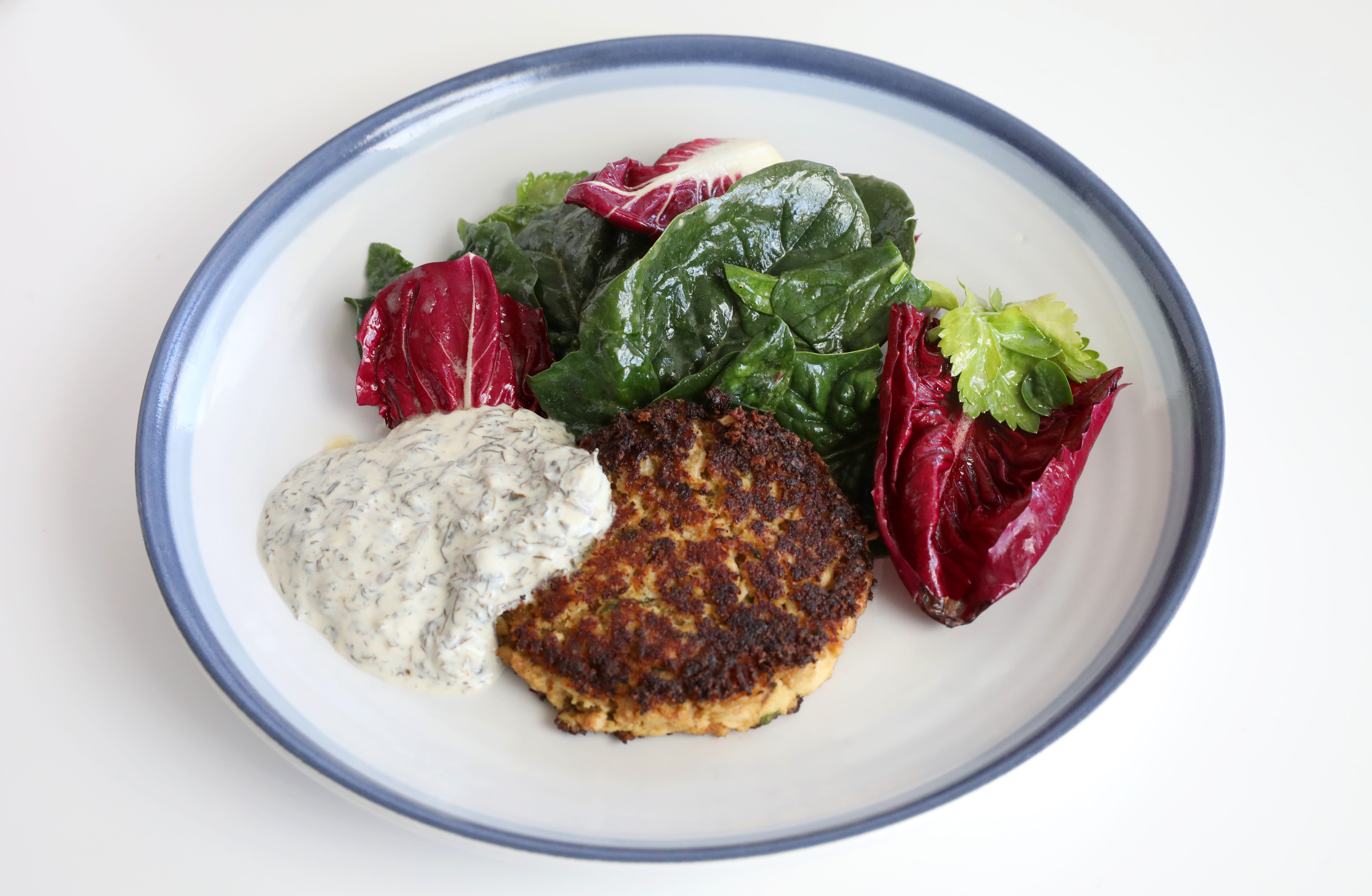 First, before we get to the lovely, crusty, fluffy, deeply savory crab cake you see up top I need to crow about this salad. Every leaf on that plate came from my garden, which was completely covered in snow just a few days ago. This recent warm spell has sent most of the snow packing, and the hardy greens (in this case spinach, radicchio, celery, mâche, and parsley) are all still alive and positively lapidary in both color and sheen. It’s hard to overstate how glad this makes me, and how the sun, longer days, and appearance of food outside my door have bolstered my beleaguered optimism. A garden is a panacea.