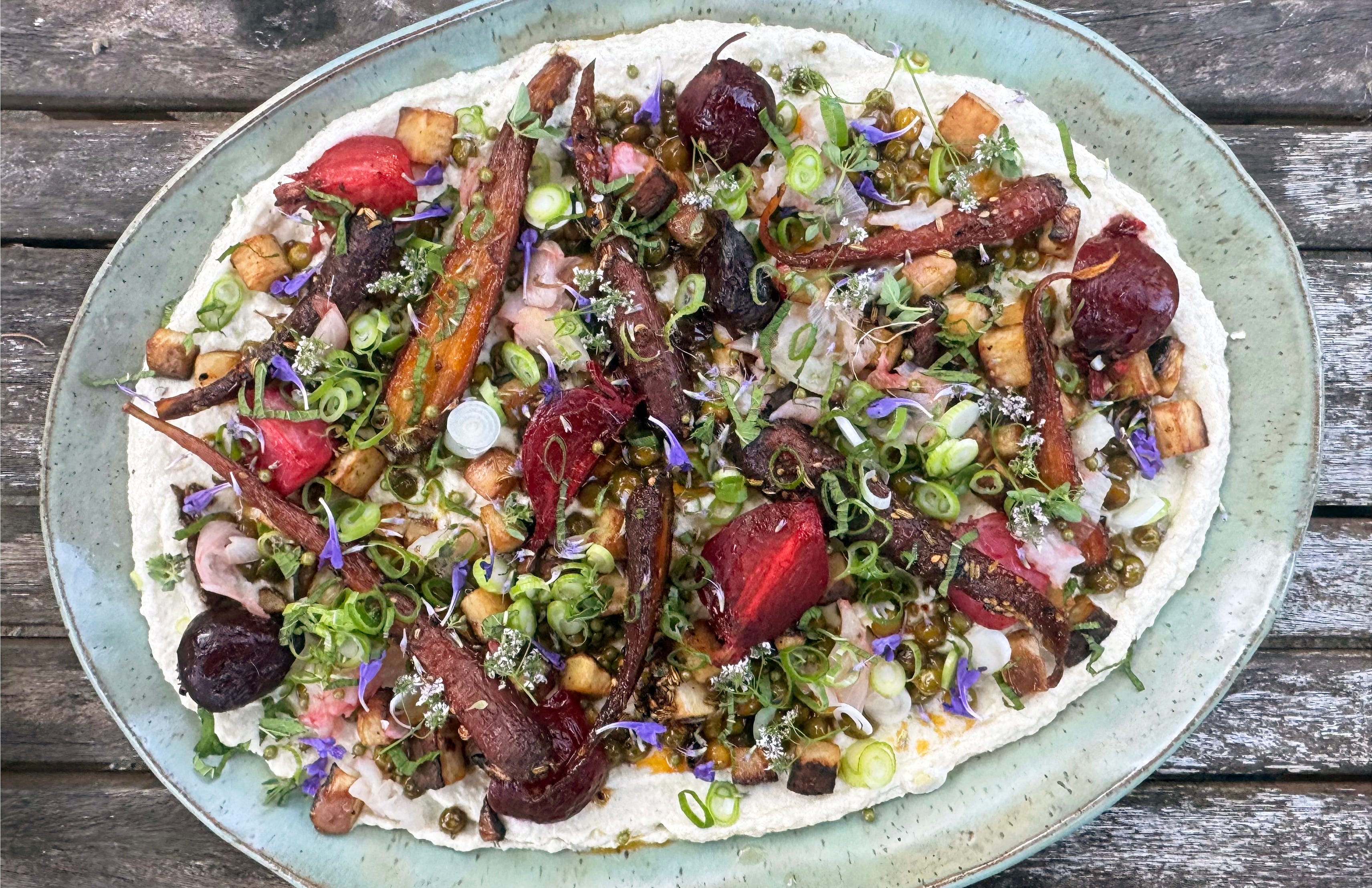 I made this dish recently for some friends who came to stay. It’s a variation on something I do pretty often, especially in the warmer months: cook a bunch of vegetables separately and then arrange them on a bed of whipped cheese like my ricotta spread, or in this case my current favorite chèvre-artichoke mixture. Scatter herbs and edible flowers over i…